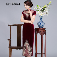 Kruidvat 奈琴尔丝绒旗袍大码长款秋冬七分袖婚宴婚礼妈妈装旗袍刺绣 S11CS