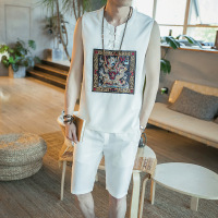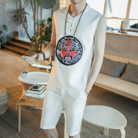 中国风龙袍刺绣背心T恤套装男士盘扣亚麻两件套无袖T恤坎袖宽肩