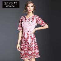 默蒂梵大码女装胖妈妈装2017夏V领网纱绣花婚庆礼服修身连衣裙粉红色