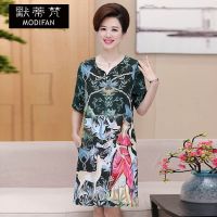 默蒂梵2017夏季新款大码女装连衣裙V领中袖桑蚕丝休闲印花中袖