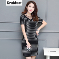 Kruidvat条纹针织连衣裙女2017夏季新款修身显瘦中长款大码女装