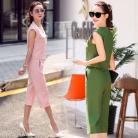 年夏季圆领无袖修身短外套韩版修身纯色小脚长裤两件套