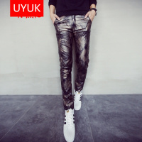 UYUK2017新款秋冬装男款修身小脚裤金色羽毛休闲皮裤青少年紧身裤美发师男裤子