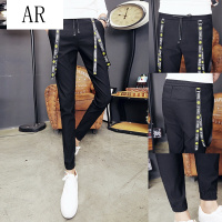 AR新款2017秋季休闲紧身裤子男韩版青少年修身小脚个性潮流裤男笑脸织带装饰小脚黑色