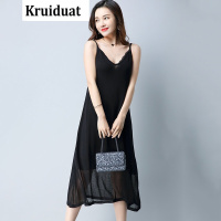 YIBUSHENG[两件装]春韩版中长款露背打底大码连衣裙开叉吊带性感背心裙