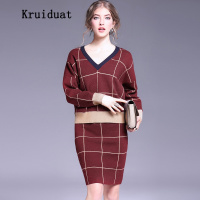 Kruidvat 奈琴尔时尚V领蝙蝠袖针织格子两件套秋冬连衣裙撞色弹力直筒套装裙LK
