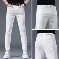 欧货白色牛仔裤男夏季薄款印花刺绣潮流修身小脚商务休闲九分裤男