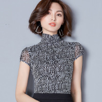 薇侣2017新品新款格子印花网纱高领短袖修身百搭打底衫女上衣
