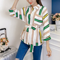 2017秋季新款时尚彩色条纹长袖翻领衬衫女中长款绑带收腰打底秋衣