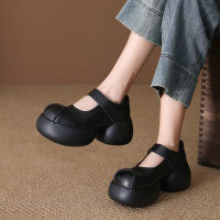头层牛皮单鞋女2026春季新款厚底复古圆头透气魔术贴高跟休闲女鞋