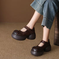 头层牛皮单鞋女2026春季新款厚底复古圆头浅口魔术贴高跟休闲女鞋