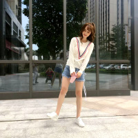 女士山羊绒开衫撞色袖清新甜美温柔风V字领单排扣春夏季新款外套