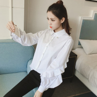 薇侣2017新品新款棉质打底时尚订珠荷叶边纯色潮流百搭韩版衬衫女