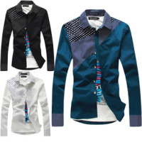 春款新品 波点拼接衬衫 男士韩版修身纯棉长袖衬衫 衬衣
