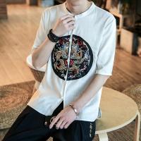 男式夏季棉麻衬衫中国风上衣神龙贴布绣花立领短袖衬衣