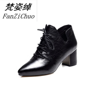 梵姿绰秋鞋女2017新款尖头粗跟单鞋女中跟工作鞋女黑色系带皮鞋女真皮黑色