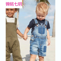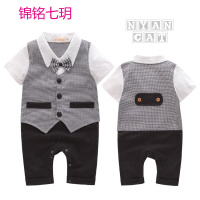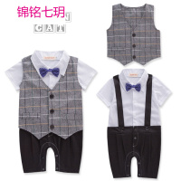 锦铭七玥夏婴儿童装 男童短袖格子领结假马甲绅士哈衣