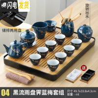 三维工匠现代侧把白瓷功夫茶具套装家用简约日式储排水茶杯盖碗茶盘台 04黑-特大流雨霁蓝梅花15头套装 18件