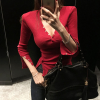春装新款紧身长袖T恤女2018针织衫夜店性感V领修身百搭打底衫上衣