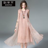默蒂梵文艺女装2017春夏季新款七分袖绣花连衣裙女宽松中长裙夏