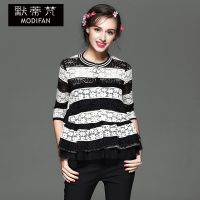默蒂梵2017春夏季时尚新款圆领女士衬衫蕾丝镂空上衣白色