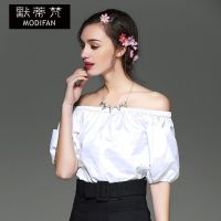 默蒂梵2017春夏女装新款露肩一字领衬衫宽松泡泡袖上衣白色