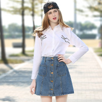 新款女式衬衫刺绣衬衣剪刀手图案百搭翻领休闲长袖衬衣衫白色