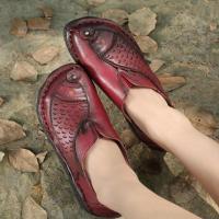 手工女鞋民族风复古年年有鱼深口软底牛筋底鱼装饰真皮鞋