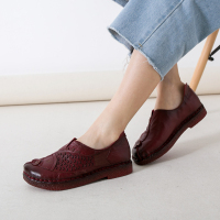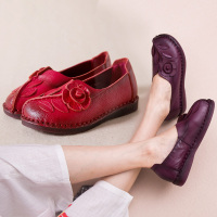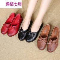 真皮手工单鞋女平底中老年妈妈鞋软底平跟圆头牛皮复古民族风女鞋