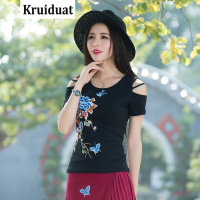 Kruidvat2017新款V领修身短款民族风牡丹蝴蝶绣花短袖T恤B078