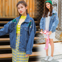 薇侣2017新品学院风宽松女装上衣刺绣花朵长袖百搭牛仔外套女