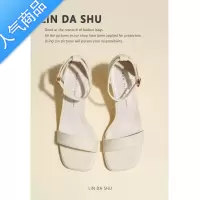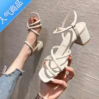 SUNTEK时尚露趾罗马一字带方头粗跟凉鞋女夏季2023年新款高跟鞋黑色中跟