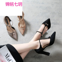 锦铭七玥欧美2018春季绒面粗跟高跟鞋女新款尖头包头中空单鞋女鞋 春