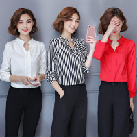 薇侣2017新品实拍韩版雪纺OL修身长袖大码简约上衣打底细竖黑白条纹衬衫女