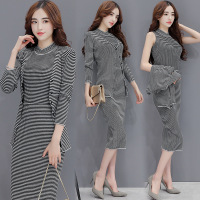 莞馨(wanxin)新款欧洲站2015秋装女黑白条纹收腰不规则开叉下摆显瘦中长连衣裙