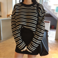 YIBUSHENG黑白条纹针织打底衫女季2023新款修身上衣小个子显瘦长袖毛衣