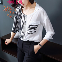 锦铭七玥通勤女装春装新款优雅黑白条纹衬衫女修身显瘦衬衣
