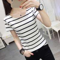 珂依舍2018春夏装新款2018夏季t恤女圆领修身黑白条纹短袖T恤