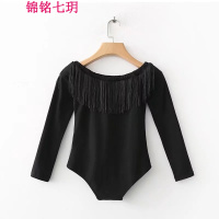 锦铭七玥欧洲站女装2018春季新款一字肩黑色流苏边长袖连体紧身衣