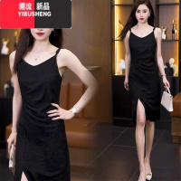 YIBUSHENG黑色吊带裙2024新款腰部褶皱连衣裙高级感气质开叉显瘦中长裙子