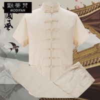 默蒂梵夏季棉麻唐装男短袖套装中老年中国风大码宽松休闲男装可印花