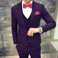 夜店主持格子西服套装秋冬季修身男装韩版潮流三件套结婚礼服新郎酒红色
