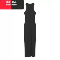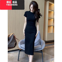 YIBUSHENG 黑色开叉长裙短袖连衣裙女季设计感修身气质裙子