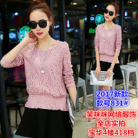 珂依舍2017秋装蕾丝衫2017春装新款女装小衫韩版圆领收腰短款女上衣修身打底衫潮