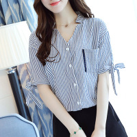 夏装韩版V领系带条纹衬衫气质显瘦百搭半袖打底小衫大码女上衣服