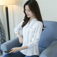2017秋装新款气质百搭V领宽松竖条纹衬衣女长袖韩范雪纺小衫上衣