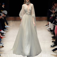 旗下2018季新晚礼服V领网纱长袖礼服女宴会装长款结婚连衣裙仙女裙米白色