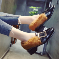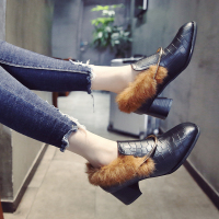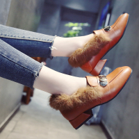 毛毛鞋单鞋女秋冬新款百搭韩版亮片粗跟加绒方头英伦风小皮鞋