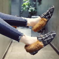 毛毛鞋单鞋女新款百搭韩版秋冬女鞋金属平底加绒格子女士鞋子