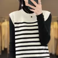 秋冬新款韩版黑白色条纹拼色马甲圆领安迪绒针织衫坎肩外搭女